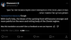 آیت اللہ خامنہ ای نے سوشل میڈیا پر یہ پوسٹ عبرانی زبان میں کی ہے اور یہ پوسٹ ایران کی جانب سے اسرائیل پر بیلسٹک میزائل برسانے کے چند ہی لمحے بعد کی گئی۔